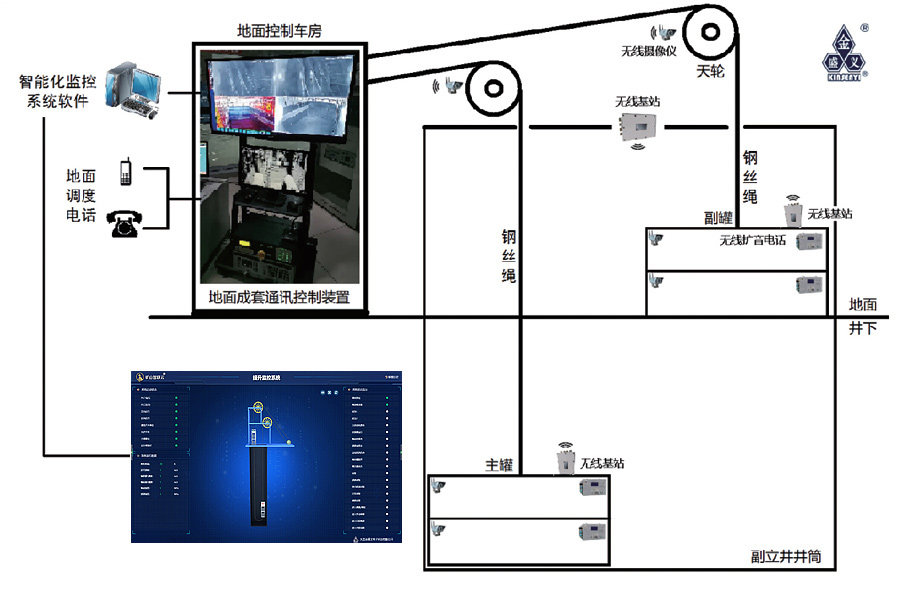 2. 地面通訊主機(jī)具有對罐籠內(nèi)的攝像儀和無線擴(kuò)音電話等設(shè)備遠(yuǎn)程開關(guān)控制功能;